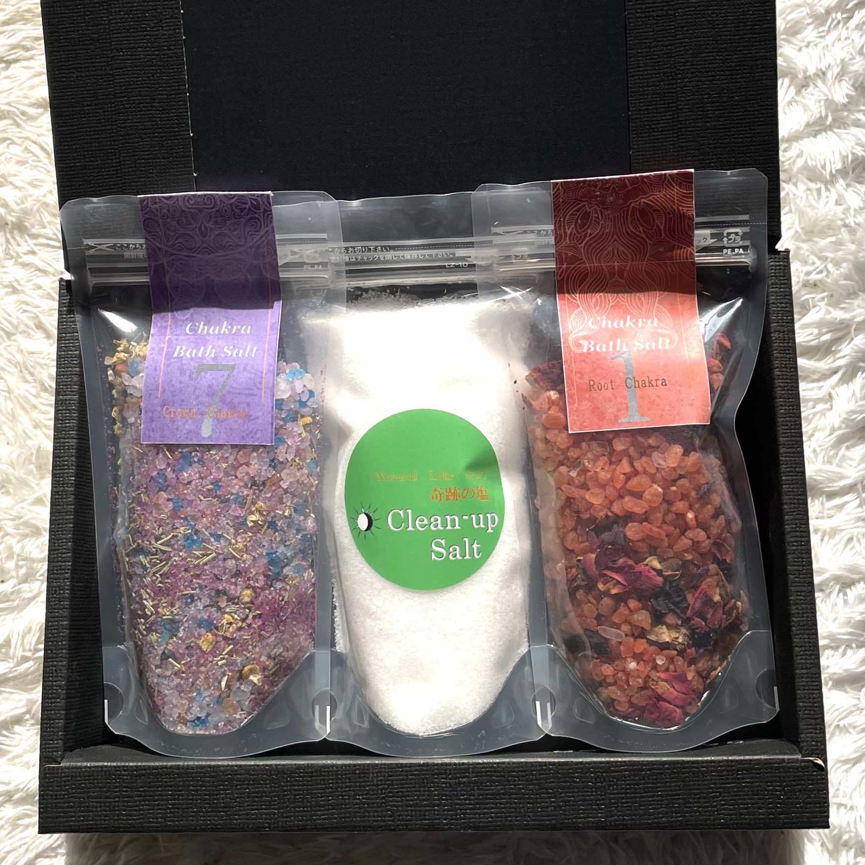 ジャイロスの定番浄化塩「クリナップソルト」と、チャクラに特化したカラーバスソルトから2品 合計3袋をセットにした嬉しいギフトボックス。