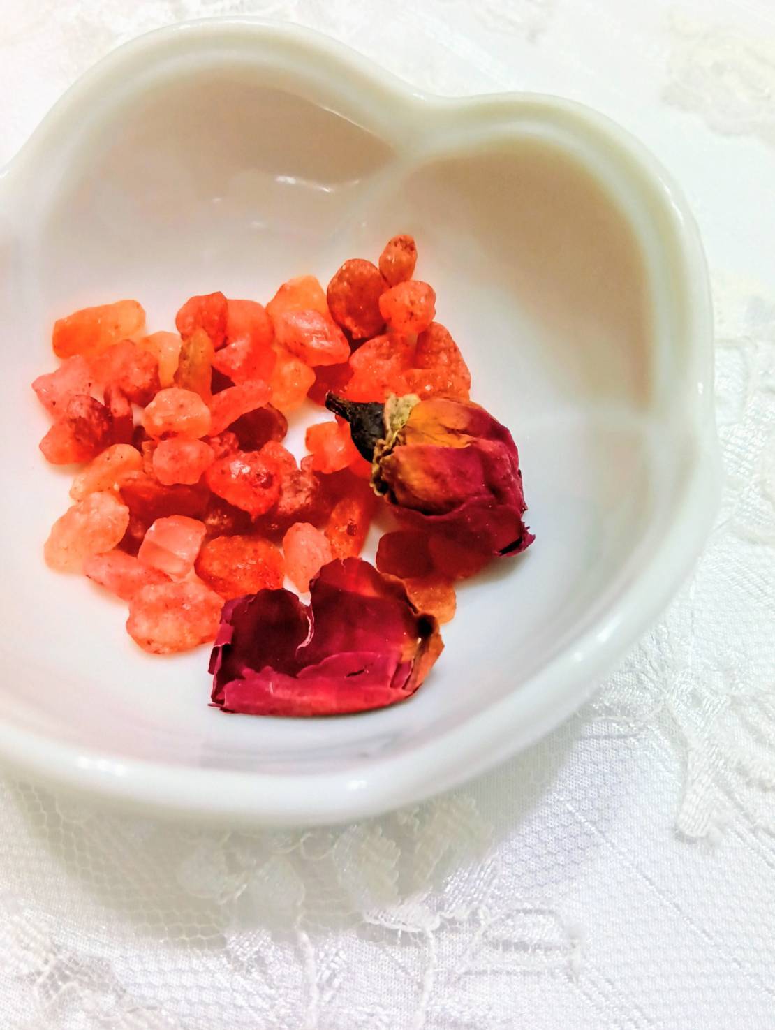 ②橙色:ヒマラヤ岩塩・レモンバーベナ・オレンジピール・ハイビスカス・グリセリン・デキストリン・橙205・赤4・赤102